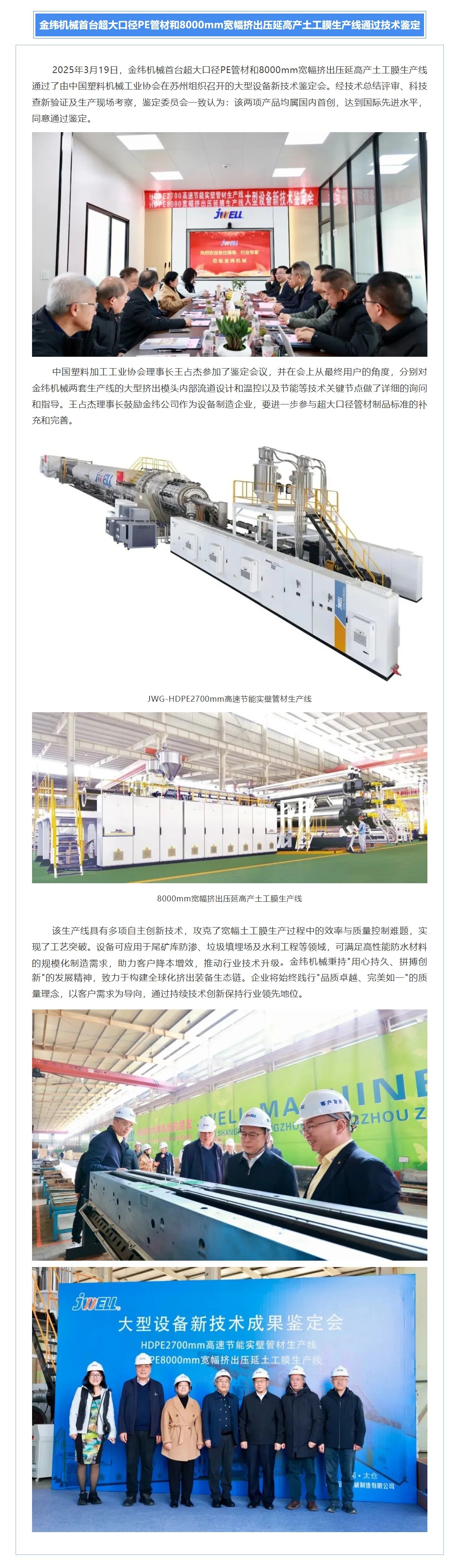 金纬机械首台超大口径PE管材和8000mm宽幅挤出压延高产土工膜生产线通过技术鉴定